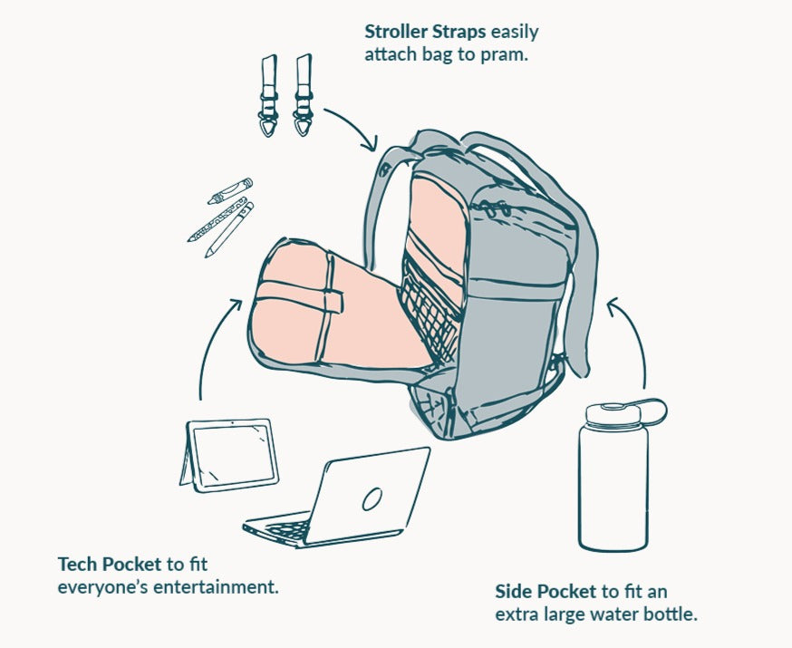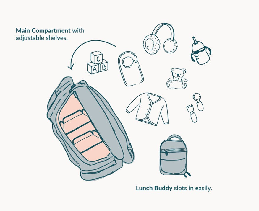 Revolutionary side access and customisable shelving. With a 27L capacity, have access to everything you need, when you need it, while on the move with your little one.