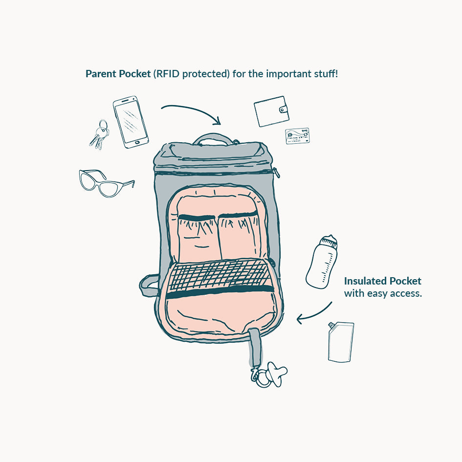 A spot for everyone’s entertainment. The tech pocket fits a 15” laptop and has additional pockets so you can carry multiple devices. Parenting is thirsty work, don’t worry, our water bottle holders can fit your XL water bottles.